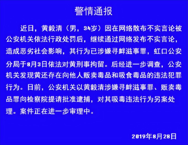 2019年8月28日,上海市公安局虹口分局通报,黄毅清因为贩毒和吸毒已经被逮捕了。
