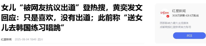 红星新闻——女儿“被网友抗议出道”登热搜,黄奕发文回应:只是喜欢,没有出道;此前称“送女儿去韩国练习唱跳”2025-08-04